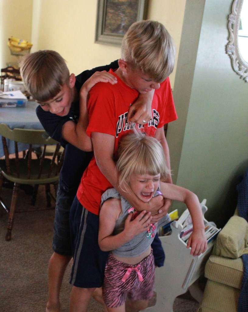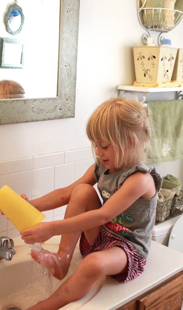 We woke up at 5:45am to the sound of water splish-splashing in the bathroom and little E sitting in the sink washing last night’s sand off her toes. We burrowed under the sheets hoping for another wink but brother #1 stumbled into the bath yelling at E to “get out” because he had to “GO!” and a wet, whiny E banged through our bedroom door screeching, “But I have to go TOO! I’m going to PEA MY PANTS!”