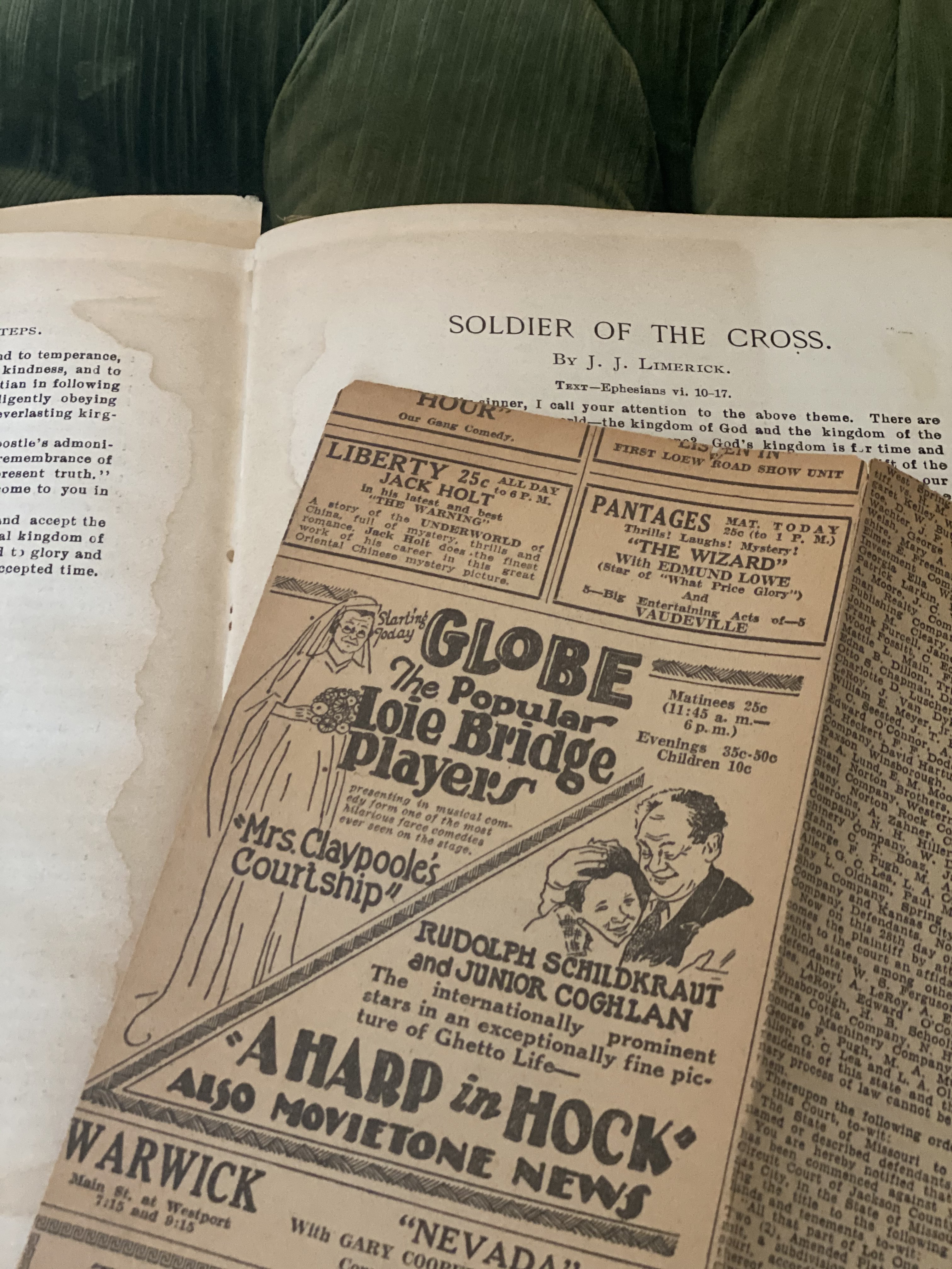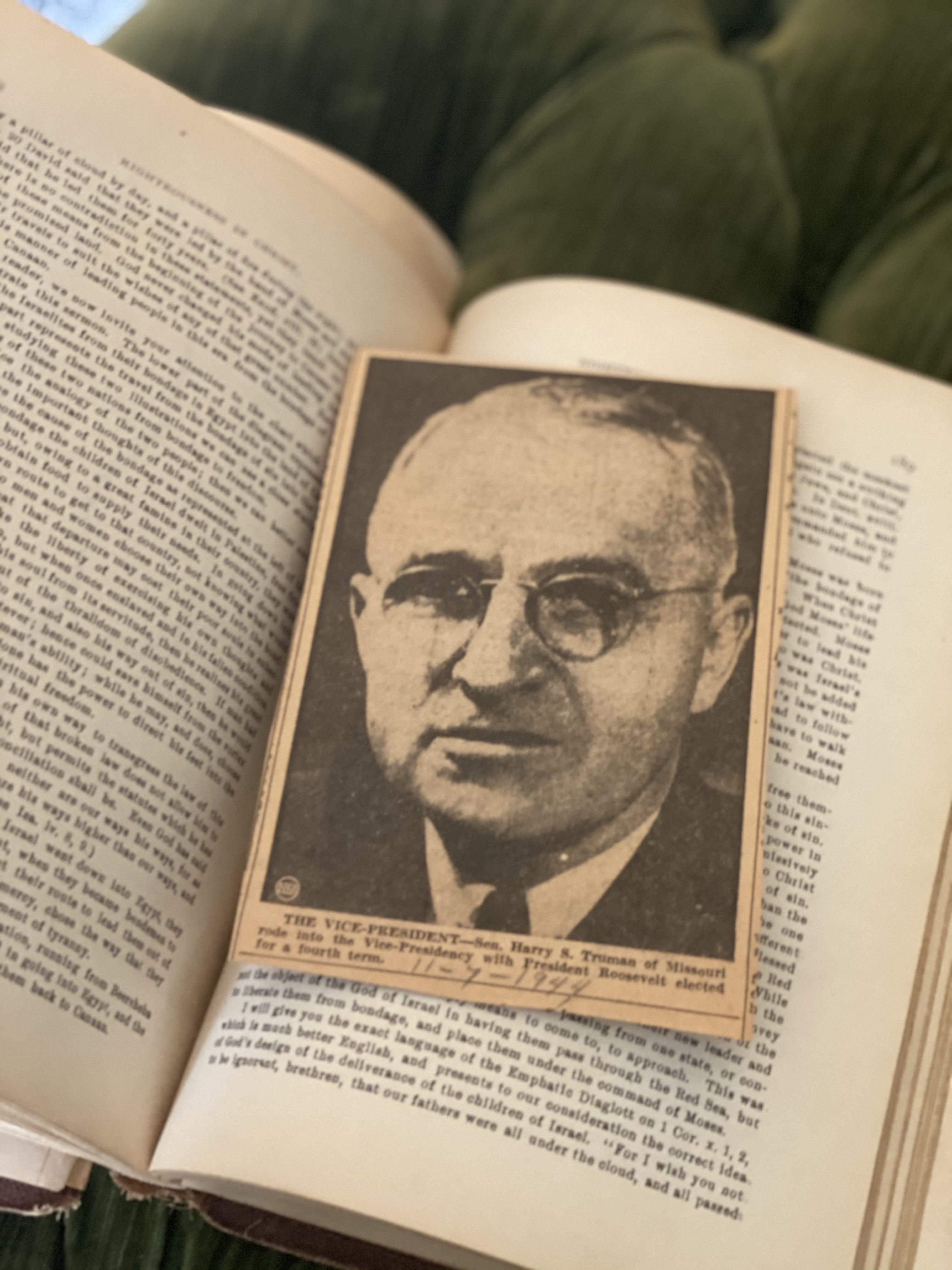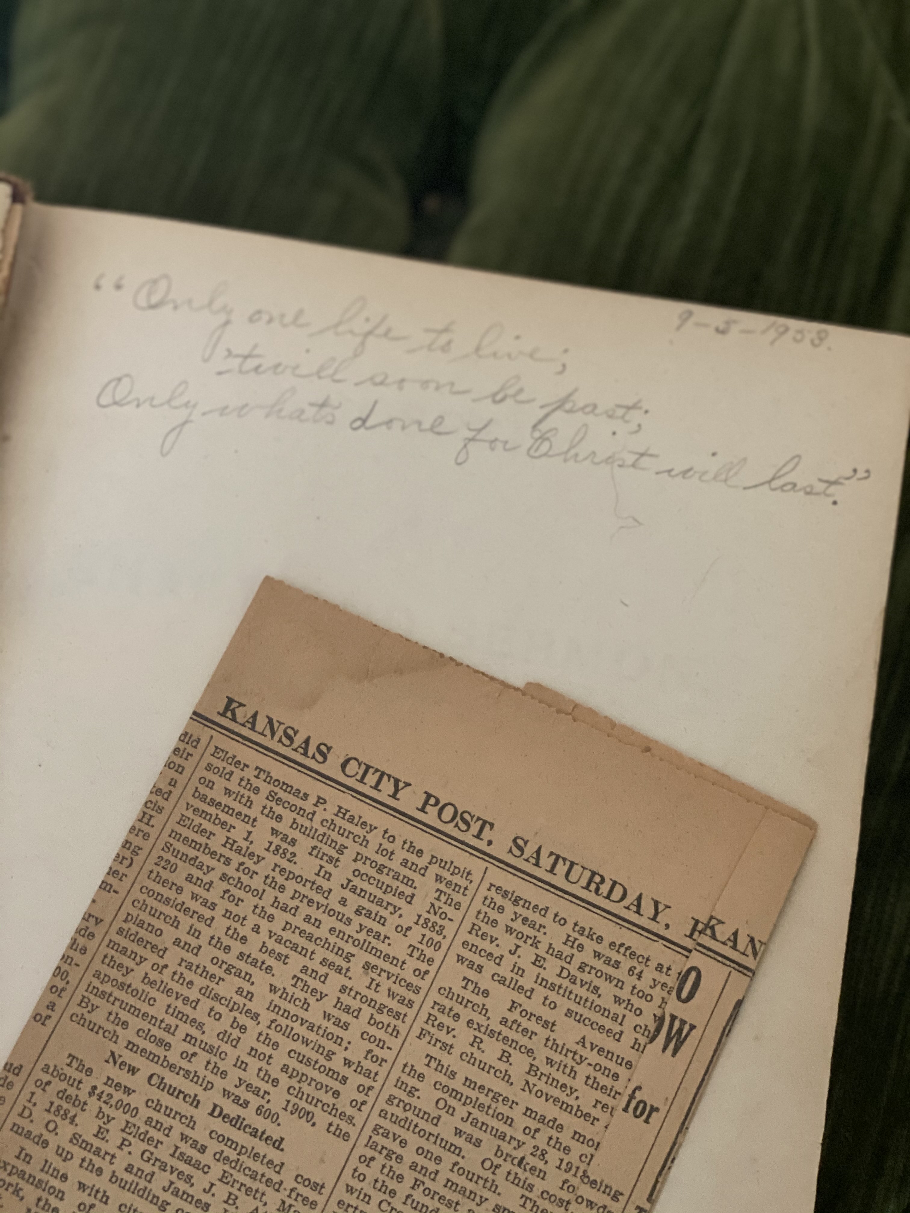 I paged through the book, uncovering newspaper clippings and notes tucked between chapters on sin, salvation, and unity of believers, spanning WW1, the great depression, WW2, personal loves and losses, spiritual wrestling and pain. I stood there, humbled and thankful for this crumbling testimony to what anchored Christian family in the past and what anchors us still—Only what’s done for Christ will last.