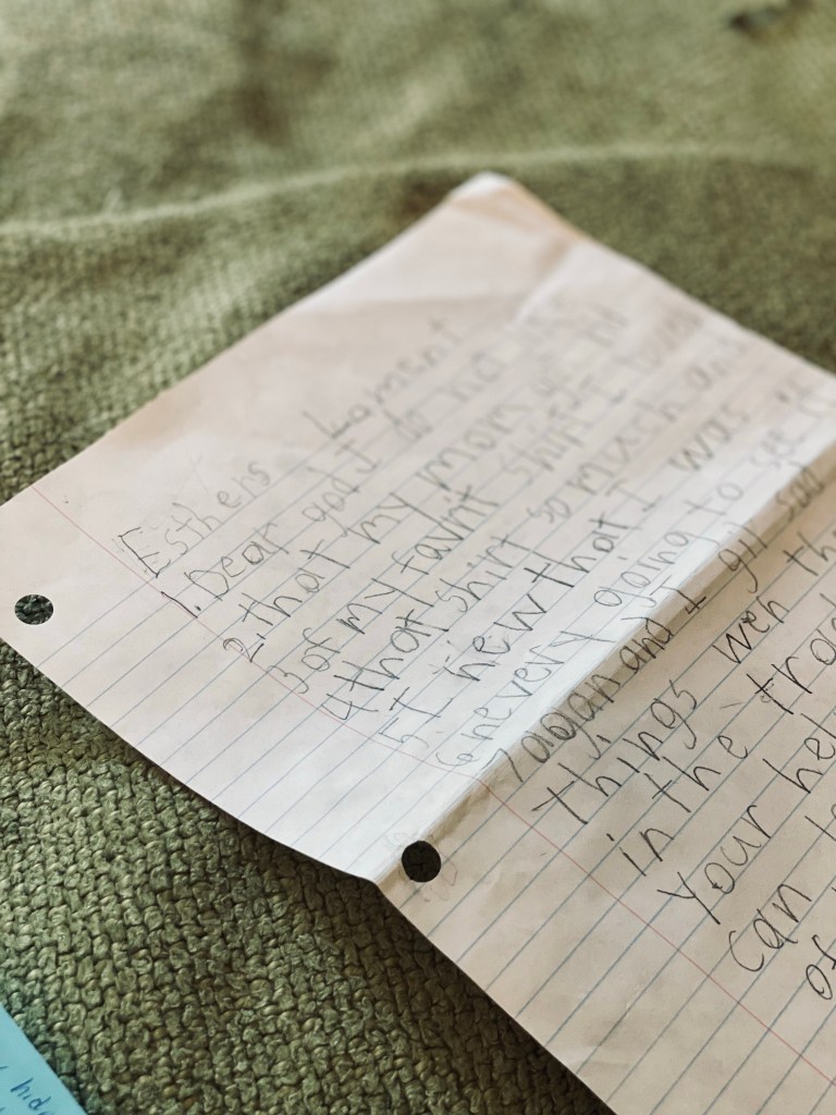“Dear God, I do not like that my mom got rid of my favorite shirt. I loved that shirt so much and I knew that I was never going to see it again, and I get sad of things when they are in the trash. I want your help so that I can learn to get rid of things without being sad, and I need to know not to hold onto things so tightly, even if I love that thing so much.” Esther.