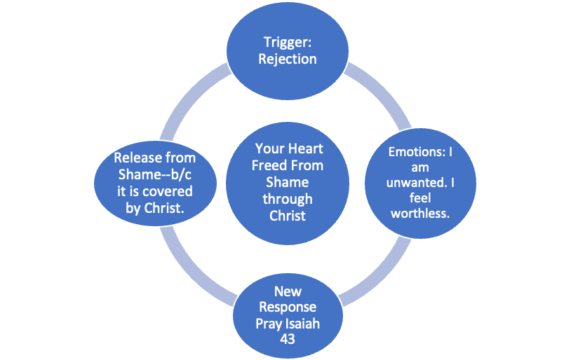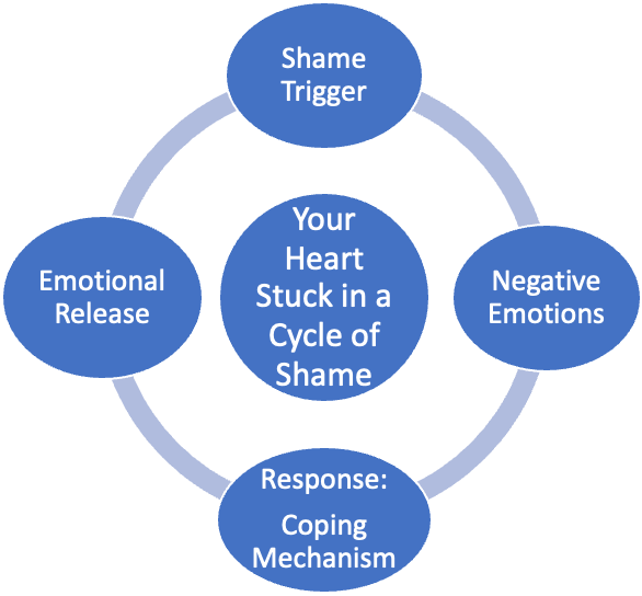 Wounded sheep also carry the shame of being cast out by their spiritual family. In the aftermath of rejection, feelings of shame are triggered in a variety of contexts unique to each person’s experience. It’s not uncommon for wounded sheep to feel stuck in a cycle of blame and shame until they are able to identify the triggers and their responses to them. The cycle of shame occurs when: